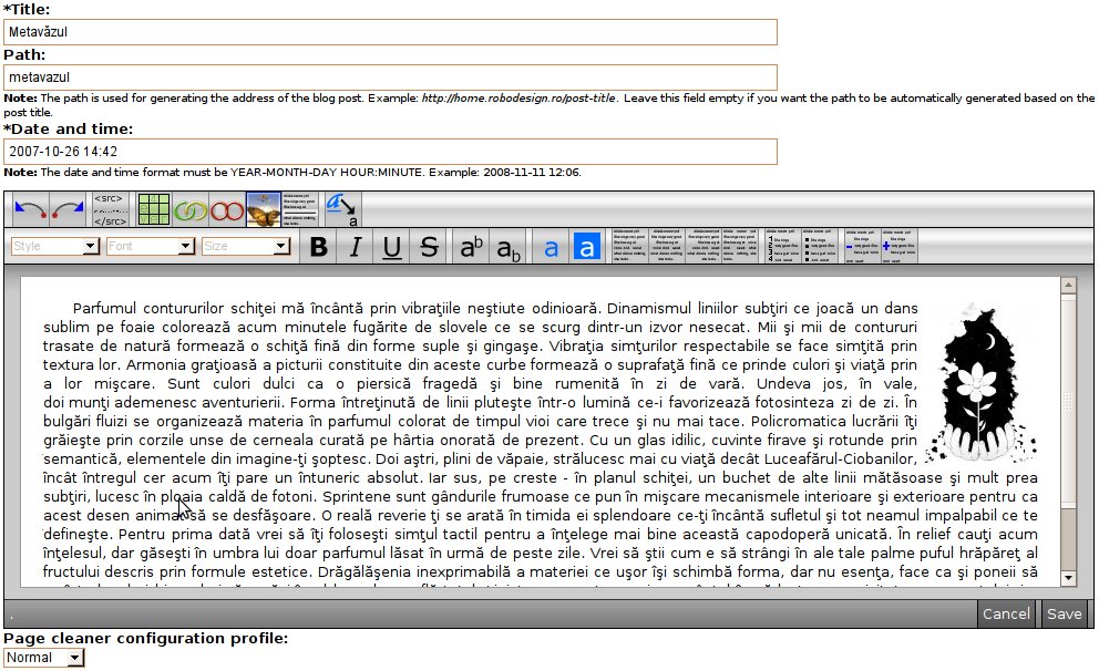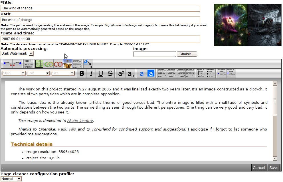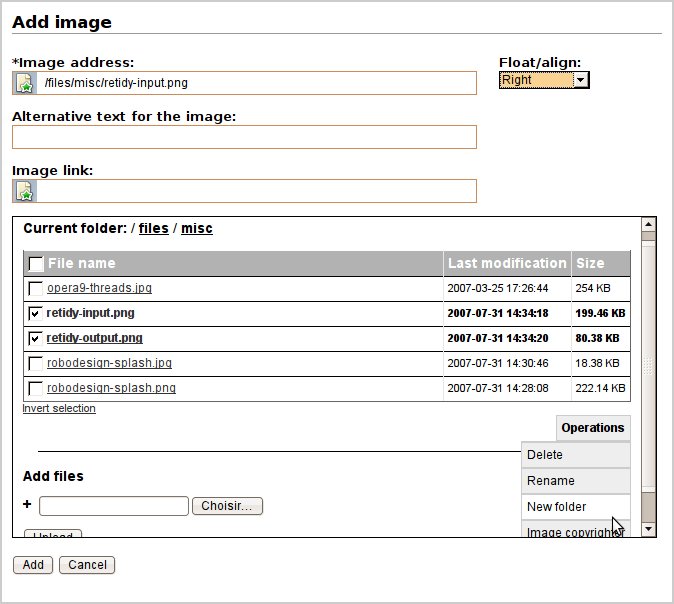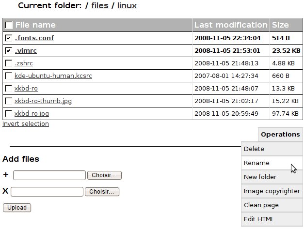 The file manager allows the user to upload multiple files, to create folders, delete and rename file/folders. The file manager also includes some plugins for editing HTML files (using Awebitor), page cleaning (using ReTidy), and image watermarking. Marius uses the image watermarker to the usual "© Year ROBO Design" on top of his images.
