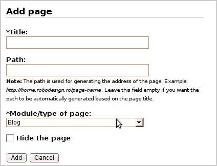 When the user adds a page, he can pick which module he wants to use: a simple article, a blog, a gallery, or an external link.