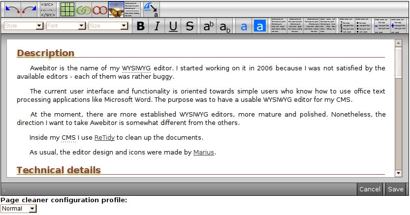 Each page can be edited using Awebitor. The user can pick to clean up the HTML document using ReTidy.